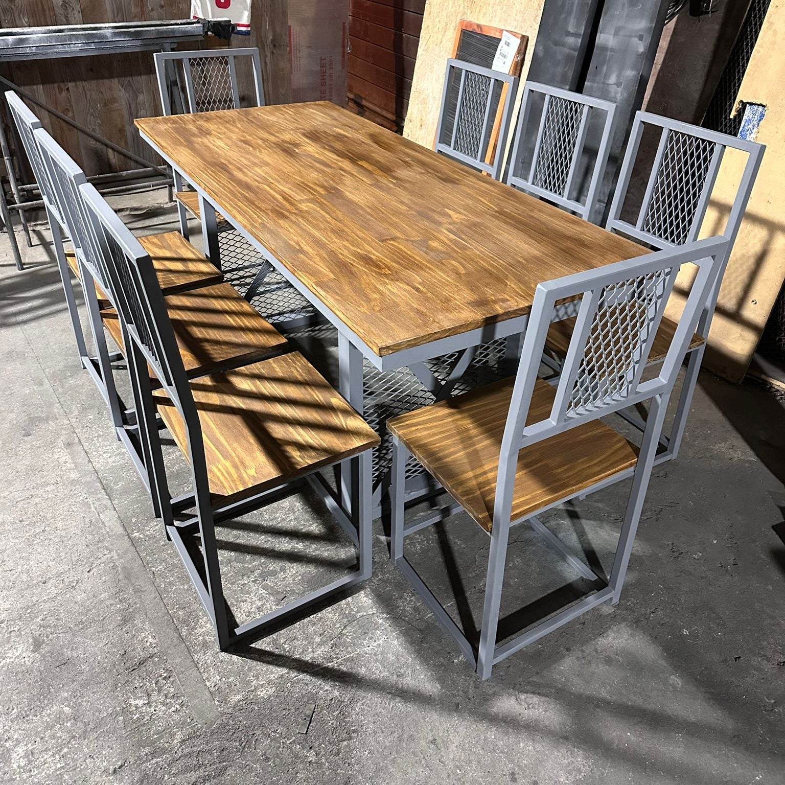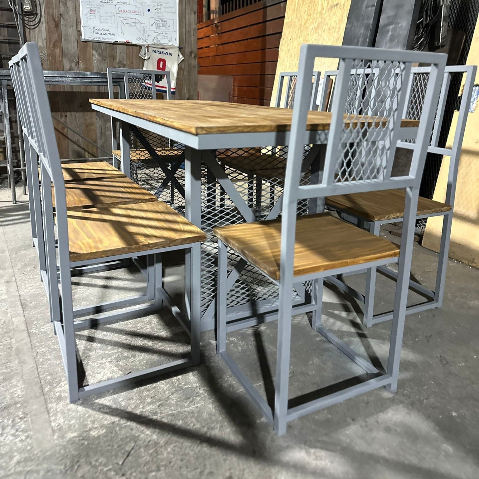 Estructura en hierro tubular, metal desplegado y tapas de madera maciza, pino finger, libre de nudos, cepillado en todas sus caras.