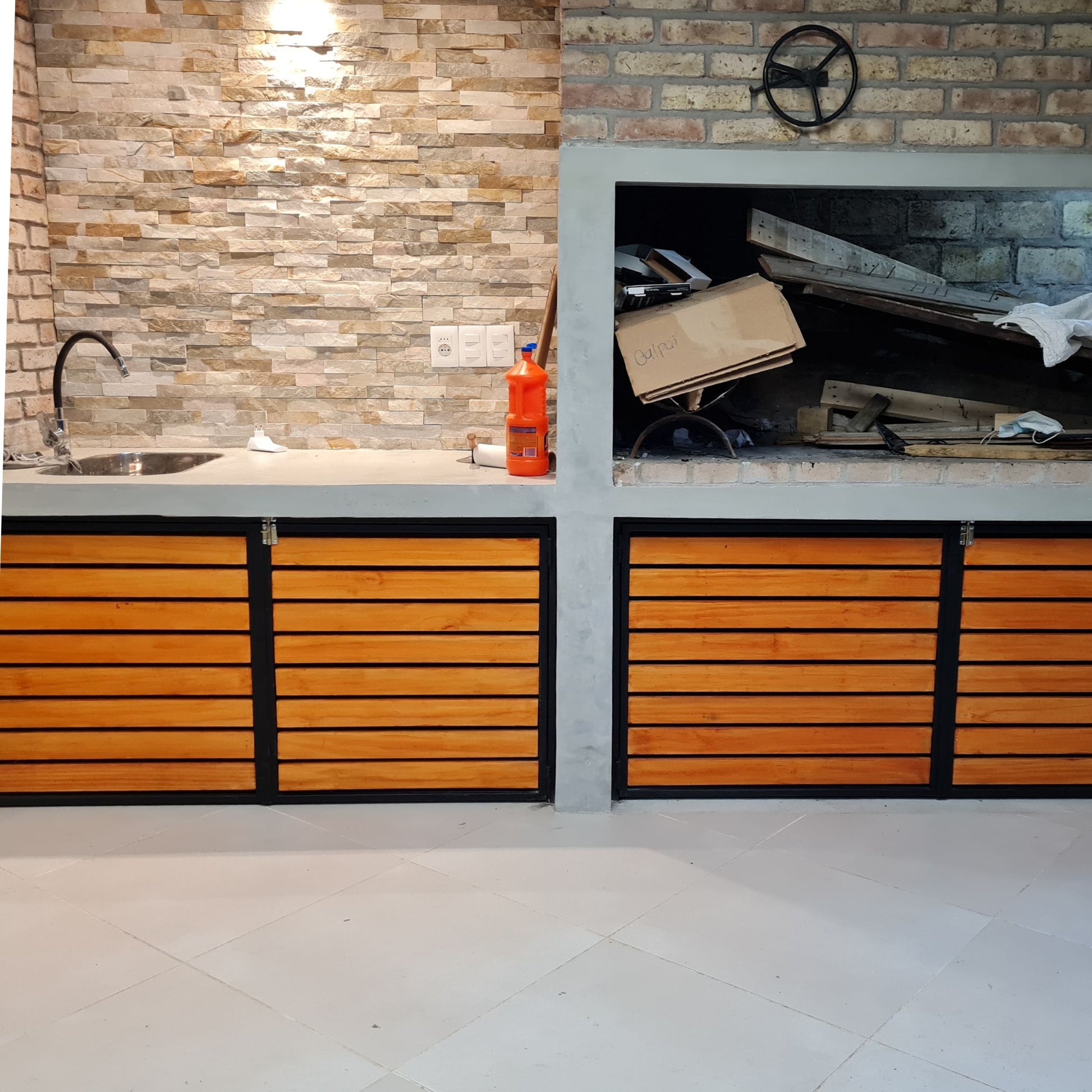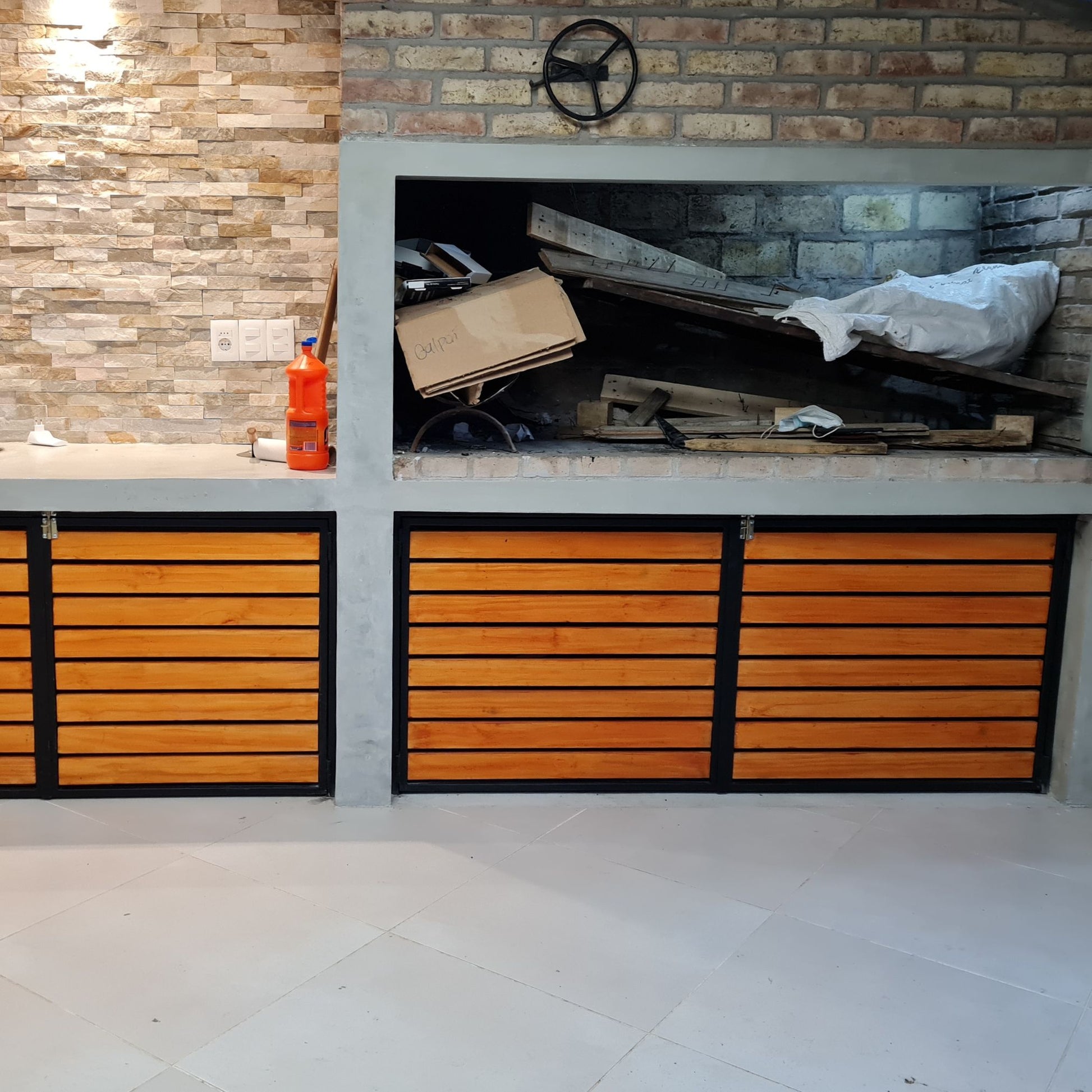 Puertas para bajo parrillero fabricadas íntegramente en hierro nuevo con estructura tubular reforzada y paneles de madera tratada con CCA para máxima durabilidad.